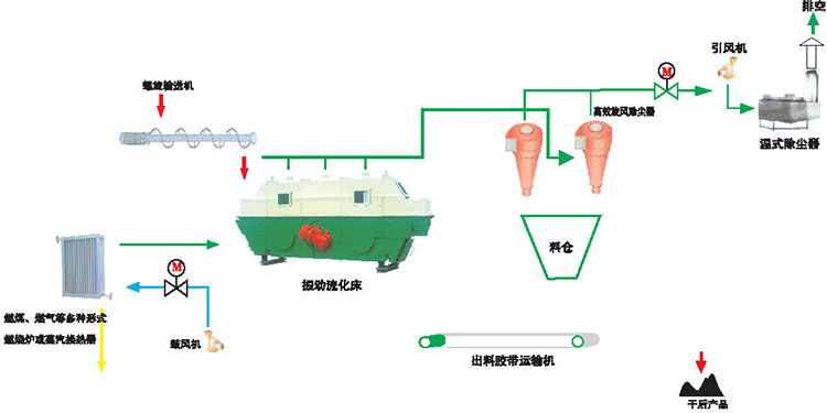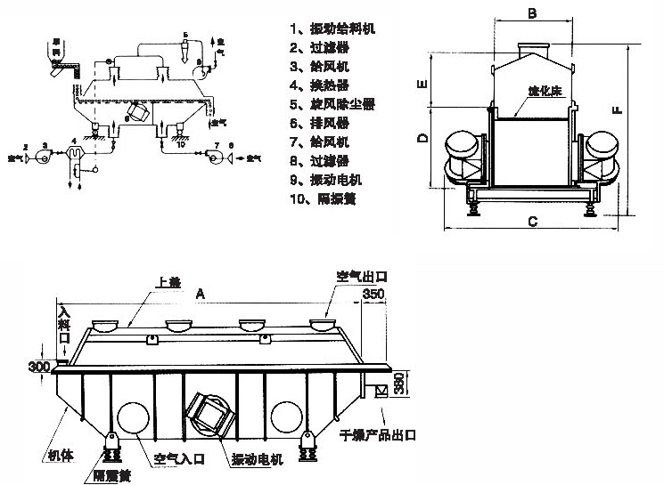 該機的特點:靠振動電機產生振動力,使機器振動,物料在振動力作用下跳躍前進,同時加熱裝置產生熱源,從下腔內輸入,使物料在沸騰的過程中與熱風充分接觸,濕空氣由引風排出,從而達到干燥目的。該機具有封閉,無污染。